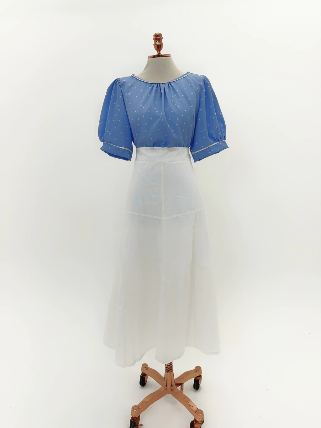 MODELAGEM: modelagem evasê até abaixo do quadril, depois ganha amplitude, tem comprimento super midi, é construída a partir de recortes, tem pala no cós para ajudar na estruturação.